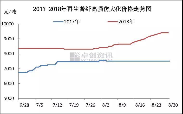 本周再生普纖主流市場行情繼續(xù)上漲,局部地區(qū)價格也有上調(diào)。截至周四江浙市場再生普纖高強(qiáng)仿大化含稅價格在9200-9600元/噸,較上周漲200元/噸。
