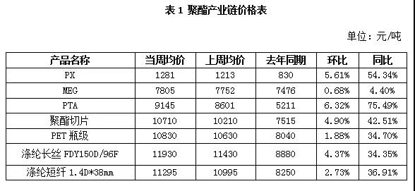 本周,卓創(chuàng)監(jiān)測的聚酯產(chǎn)品及原料板塊中產(chǎn)品全部上漲。漲幅第一位的是PTA,環(huán)比上漲6.32%,本周因PTA現(xiàn)貨維持高升水結(jié)構(gòu),在補(bǔ)升水行情推動下PTA期貨延續(xù)漲勢。